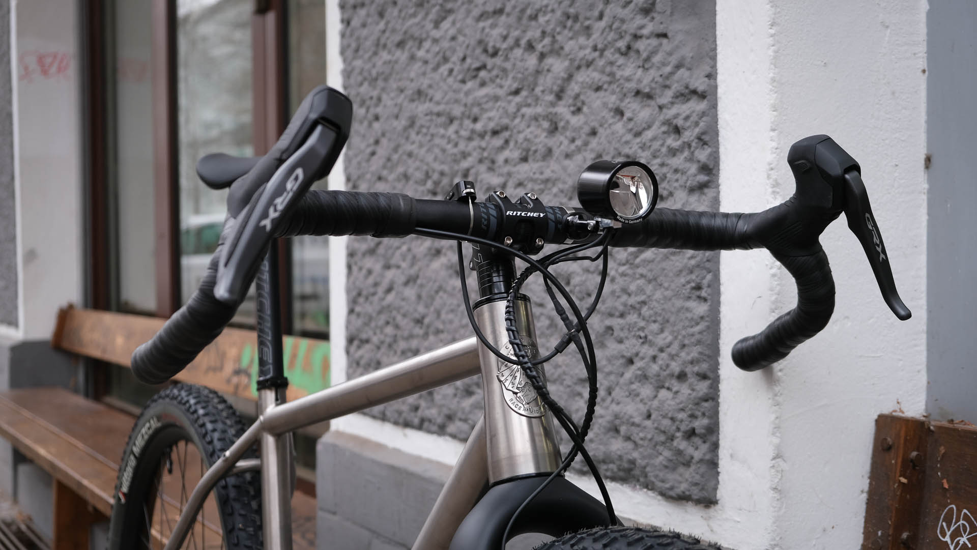 It was time for a another new bike for our long time customer Carsten! This time we are looking for something very off-road capable: The Curve GMX+ steel with tyre width up to 29×3″ was the perfect candidate! We build the bike with purple Hope Tech Pro 5 hubs laced to wide W33i Syntace rims (and purple nipples) and combined them with well proven Vittoria Mezcal tyres. The GRX 1×11 group was combined with a White industries crankset that matches the steel frame beautifully.